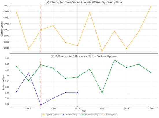 Figure 5 presents the results of two analyses evaluating the impact of ISO adoption on system uptime. In the Interrupted Time-Series Analysis (ITSA), the yellow line represents fluctuations in system uptime before and after the adoption of ISO (marked by the red dashed line in 2017). While some changes are visible, adopting ISO does not consistently and drastically shift the system uptime. In the difference-in-differences (DID) analysis, the blue line represents the control group (non-ISO adopters), and the green line shows the treatment group (ISO adopters). After 2017, the treatment group showed some upward trends, suggesting a modest effect from the ISO adoption; however, the differences between the groups remained small, indicating that the impact may not be as significant as anticipated. Further analysis of more extensive data could provide a clearer picture.