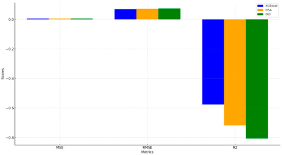 Figure 6 presents a comparative analysis of three models—XGBoost, ITSA, and DID—using MSE, RMSE, and R2 metrics. Among these, XGBoost demonstrates superior performance in MSE and RMSE, reflecting its ability to minimize prediction errors and offer more reliable estimates compared to ITSA and DID. While the R2 values for all models are currently negative, indicating challenges in explaining the variance in system uptime, these findings provide valuable insights for future enhancements. The results underscore the potential for significant improvements through refined feature selection, advanced data preprocessing, or the inclusion of additional variables. Overall, the evaluation highlights XGBoost’s promise as a foundation for developing more accurate predictive models while identifying clear opportunities to strengthen model fit and explanatory power across all approaches. The negative R2 observed in certain regression models may indicate that the linear predictors fail to capture the variance present in the data. This outcome suggests the presence of non-linear patterns or external confounding variables influencing performance metrics.