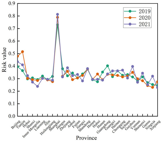 According to Table 3, the digital economy information security risk values and risk rankings of various provinces have undergone significant changes over time. Figure 2 provides a more intuitive illustration of this change. Between 2019 and 2021, there were certain differences in the digital economy information security risk values among different provinces. Shanghai has always been the province with the highest risk of digital economy information security, while Xinjiang has the lowest overall risk. The digital economy information security risk values in Hebei, Shanghai, Zhejiang, Fujian, Shandong, Guangxi, and Guizhou have been increasing year by year, while those in Shanxi, Inner Mongolia, Liaoning, Jiangsu, Jiangxi, Hunan, and Sichuan have been decreasing year by year.