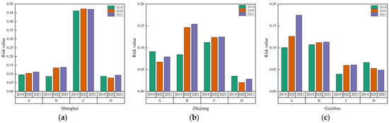 (a) Shanghai primary indicator risk values over time; (b) Zhejiang primary indicator risk values over time; (c) Guizhou primary indicator risk values over time.