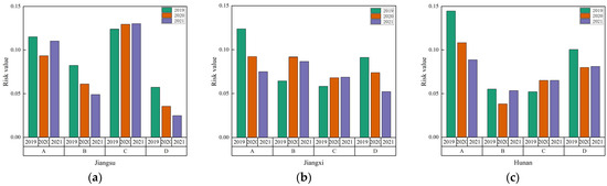 As shown in Figure 4, the decrease in Jiangsu’s risk value is mainly due to the information dimension and the information environment dimension. Specifically, this is attributed to the reduction in the scale of false information and data resources, as well as the decrease in all secondary indicators under the information environment dimension. The decrease in Jiangxi’s risk value is mainly due to the information personnel dimension, specifically the improvement in information security awareness, which corresponds to Jiangsu’s ongoing cybersecurity publicity campaigns and educational efforts. The decrease in Hunan’s risk value is also mainly due to the information personnel dimension, specifically the improvement in information security awareness and the reduction in digital criminal activities, which corresponds to Hunan’s public security authorities’ stringent crackdown on telecommunications network fraud and other criminal activities. Although the risk reduction in these three provinces is significant, the overall level of digital economy development is still increasing [54], effectively balancing the development and security of the digital economy.