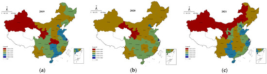 (a) China’s digital economy information security spatial pattern in 2019; (b) China’s digital economy information security spatial pattern in 2020; (c) China’s digital economy information security spatial pattern in 2021.
