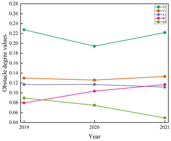 Annual obstacle degree values for secondary indicators from 2019 to 2021.