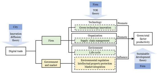 The theory of innovation diffusion supplements this viewpoint by detailing how new technologies and sustainable practices disseminate throughout businesses and industries [24]. Digital trade platforms accelerate the dissemination of green technologies and practices through greater trade liberalization, financial deepening, and knowledge spillovers due to their global reach and real-time data capabilities [25]. Additionally, businesses can use digital platforms to more effectively coordinate their supply chains, achieving the seamless integration of environmental standards and resource optimization across multiple stakeholders [9]. Conversely, digital service trade barriers hinder the development of production specialization [26], further highlighting digital trade’s role in enhancing production efficiency. The Technology–Organization–Environment (TOE) framework [27] further elucidates how these dynamics unfold at the firm level. It categorizes the factors influencing a firm’s or organization’s implementation of technological innovation into technological, organizational, and environmental dimensions. The TOE framework has the capacity to examine the manner in which technological, organizational, and environmental factors interact to influence the relationship between digital trade and GTFP.