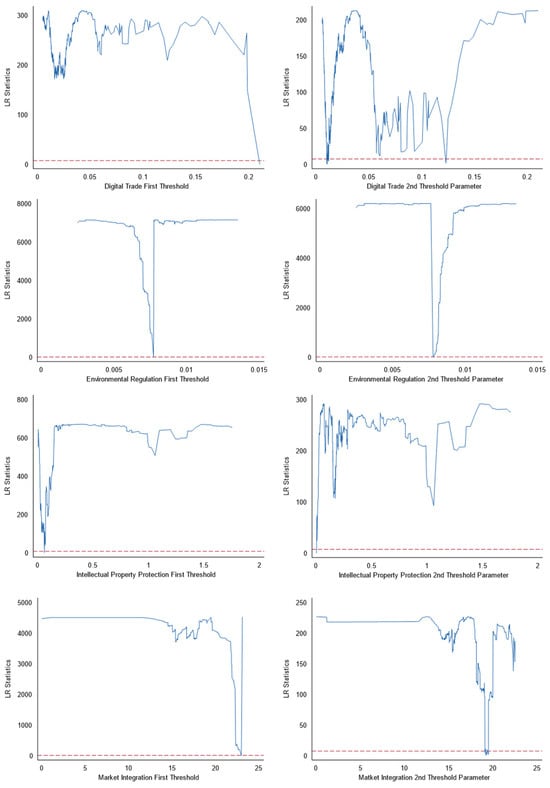 Although digital trade can promote the improvement of GTFP, the magnitude and direction of these effects vary depending on the institutional environment. According to institutional theory [41], external institutional factors, such as regulatory frameworks, intellectual property protection, and market structure, fundamentally shape the incentives and constraints that firms face when adopting new technologies and sustainable practices. Previous research has shown that these institutional factors can produce non-linear effects, or threshold dynamics, whereby the relationship between digital trade and GTFP varies under different institutional conditions [12,13,14].