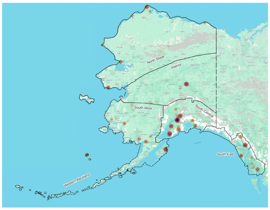 A total of 198 organizations offering marine science education were identified and categorized by type—libraries, national parks, universities, permanent science centers, and outreach-focused nonprofits. The analysis revealed substantial disparities in access, marked by a pronounced rural–urban divide. Anchorage, Fairbanks, and Juneau hosted a concentration of resources, while smaller and more remote communities remained underserved, even in the regions where those urban centers were found. We mapped 198 organizations using a heatmap tool in QGIS 3.34 Prizren (