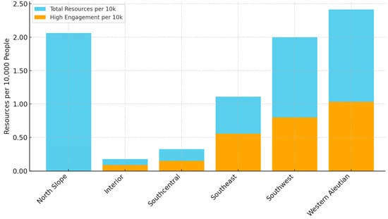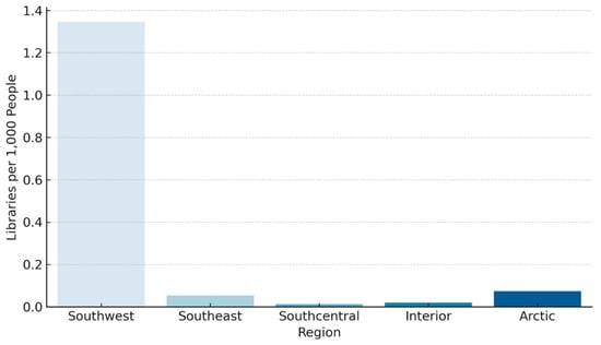 Libraries were analyzed for urban/rural distribution and per capita access, revealing a distinct pattern of structural reliance on small, decentralized facilities in rural Alaska. While rural Alaskans benefit from significantly higher library density per capita—0.32 libraries per 1000 people compared to 0.08 per 1000 in urban areas—this apparent advantage masks underlying disparities in service capacity, staffing, and programming. For example, while