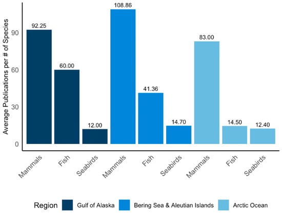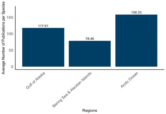 Exxon Valdez Oil Spill, had the highest number of publications per species, driven in part by access to research infrastructure, long-standing institutional presence (e.g., UAF, NOAA Auke Bay), and the presence of well-monitored fisheries. The Bering Sea and Aleutian Islands—despite their ecological richness and importance to subsistence economies—had the lowest publication-to-species ratio. For example, Arctic char and Dolly Varden, which are central to rural and Indigenous subsistence practices, were notably underrepresented in the literature compared to more commercially prominent species such as salmonids. Specific shellfish and other tidepool animals represented under 20 papers across the “fishes” category.