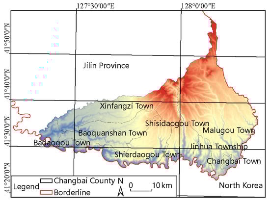 Changbai County is situated in the northeastern border region, south of the Democratic People’s Republic of Korea, with the Communist Party of Korea located across the river. The length of the border line measures 260.6 km, encompassing an area of 2505.96 square kilometers (Figure 1). The county is governed by seven towns and one township and features a state-class port (Changbai Port), which serves as a crucial gateway for economic cooperation in northeast Asia. It is a significant node in the One Belt, One Road, playing an essential role in the northern strategy, particularly in the development and opening of the Yalu River economic zone [63]. Changbai County is dedicated to transforming and developing its tertiary industry, leveraging the Border Economic Cooperation Zone to promote mutual trade, specialty ethnic culture, and tourism. The county aims to play a more active role in northeast Asian economic cooperation through five key industries: tourism, border trade, diatomaceous earth processing, food and medicine, and health and modern services. According to national census data, the Jilin Provincial Statistical Yearbook, and the Changbai County Statistical Bulletin, the population was 58,300 in 2020, with a per capita GDP of only CNY 43,900, accounting for 6.66% of Baishan City’s GDP. Local financial income decreased by 13.21%, while tax revenue fell by 7.4%. Additionally, the resident population declined by 14,300 people from 2010 to 2020, reflecting an average annual decrease of 2.17%. This trend is characteristic of a border economic cooperation zone, marking it as a typical example of a shrinking border city.