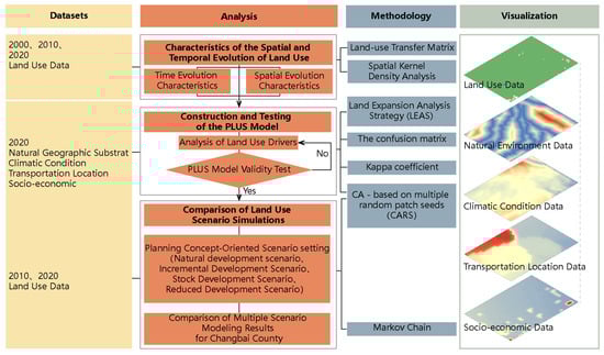 First, this study utilized land use data from Changbai County for 2000, 2010, and 2020 to reveal the spatial and temporal evolution characteristics of land use in the region. This was achieved through the application of the land use transfer matrix and spatial kernel density analysis methods. Secondly, using data extracted on land use expansion between 2010 and 2020 and incorporating key driving factors such as the natural environment, climatic conditions, transportation infrastructure, and socio-economic factors, the development probabilities for each type of land use were calculated. The contribution of these expansion factors was assessed using the Land Use Change Analysis Tool (LEAS) within the PLUS model. Again, using the 2010 land use data and the calculated development probabilities, the land use in 2020 was simulated with the help of the CA modeling tool (CARS) for multiple classes of random plate seeds in the PLUS model. In order to verify the accuracy of the simulation results, the simulation accuracy validation tool in the model was used, and the overall classification accuracy, user accuracy, producer accuracy, and Kappa coefficient were calculated through the confusion matrix, confirming the reliability of the model. Finally, the Markov chain tool and CARS in the PLUS model were combined to predict the land use demand of Changbai County in 2030 under the guidance of different planning concepts, and the corresponding land use scenarios were simulated. These prediction results provide a scientific basis for land use planning in Changbai County and a reference for future land management strategies. The following data and the technical route of the research methodology are shown in Figure 2.