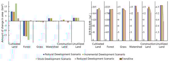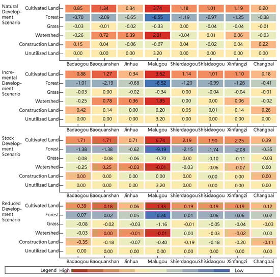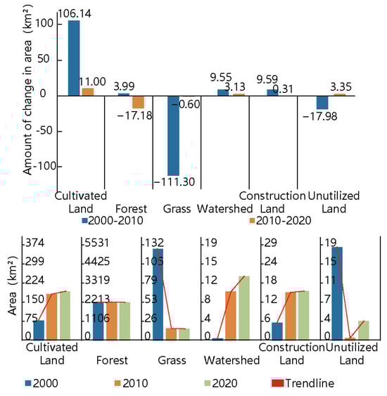 Combined with the land use transfer matrix from 2000 to 2020 (Table 4 and Table 5), the areas of arable land, watershed, and construction land have increased by 117.13 km2, 12.70 km2, and 9.90 km2, respectively. (1) Notably, the increase in arable land is 11.83 times greater than that of construction land. Conversely, the areas of grass, unutilized land, and forest land have decreased by 111.90 km2, 14.63 km2, and 13.21 km2, respectively, with the total decrease in grass being 8.47 times that of forest land. Cultivated land is primarily converted from forest land and grass, while grass is mainly converted to forest land and cultivated land, with only a small portion of grass being transferred to construction land. (2) Combining the changes in land use dynamics in the two phases of 2000–2010 and 2010–2020, it is found (Figure 3) that cultivated land, watershed, and construction land all show an inertial development trend of continuous increase and that the development rate slows down in the second phase, with the slowdown of construction land being the most obvious. Unutilized land shows a V-shaped trend of first decreasing, then increasing, and the growth rate in the second stage is smaller than the decrease rate. Forest land shows a trend of increasing first, then decreasing, and although grass shows an inertial shrinkage trend of continuous decrease, the shrinkage rate slows down obviously in the second stage. (3) Under the background of population contraction and development, the area of construction land in Changbai County from 2000 to 2020 is mainly transferred from cultivated land and forest land, accounting for 55.15% and 32.40%, respectively. the growth rate of construction land from 2000 to 2010 is 86.79 times that of 2010 to 2020, and the types of land transferred in the two phases are both cultivated land (57.47%) and forest land (30.84%). The area transferred from cultivated land (57.47%) and forest (30.84%) in the two phases is 7.38 km2 and 3.96 km2, respectively, and the area transferred from other types of land is 1.50 km2 in total.