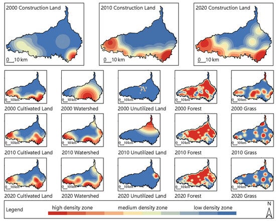 Combining the kernel density distribution of land use from 2000 to 2020 (Figure 4), the following observations can be made: (1) The spatial agglomeration of construction land, cultivated land, forest, and watershed areas has increased. Construction land and cultivated land have developed two primary centers in the southeast and the west, while water areas have formed a relatively decentralized polycentric structure. Additionally, the center of forest land has gradually shifted towards the central–northern region. (2) The spatial aggregation of both grass and unutilized land has diminished, with grass transitioning from a polycentric to a monocentric distribution in the north and unused land migrating from the north–central region to the eastern part of the country. (3) The primary center of construction land remains consistently located in Changbai Town along the border, exhibiting spatial characteristics of synergistic development with Malugou Town. The secondary center is situated in the inland Badaogou Town and extends towards the central city of Baishan.