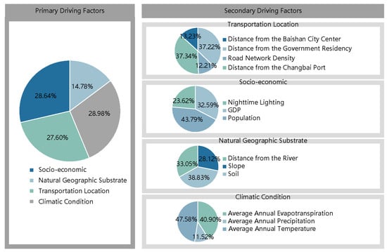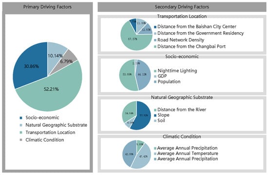 Combining the contribution levels of various drivers to land use change in 2020 (Table 6, Figure 5 and Figure 6), the following findings emerge: (1) Among the primary drivers, climatic conditions (28.98%), socio-economic factors (28.64%), and transportation location (27.60%) significantly impact land use change, while the natural geographic substrate (14.78%) has a comparatively smaller effect. (2) Among the secondary driving factors, distance to the port, population density, soil conditions, and average annual evapotranspiration exhibit notable effects on land use change. (3) Changes in construction land use are primarily influenced by transportation location (52.21%) and socio-economic factors (30.86%). Additionally, among the secondary driving factors, distance to the port, nighttime lighting, slope, and average annual temperature have significant effects on changes in construction land use.