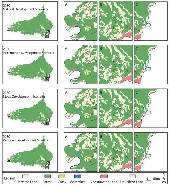 Four land use scenarios were established based on distinct planning concepts: natural development, incremental development, stock development, and decremental development. These four scenarios correspond to the varied development logic of the “natural trend–expansion–intensification–contraction response”, from inertia continuation to active intervention and addressing diverse demands. This framework provides systematic support for the comprehensive assessment of land use changes and their impacts under different development models. The specific details are outlined as follows (Table 3): (1) Natural development scenario: According to the transfer probability matrix of land use from 2010 to 2020, the current trend of land use change will continue through 2030. (2) Incremental development scenario: The incremental development scenario is a plan that uses new construction land supply as the main means to promote urban development, mainly by expanding the scale of land use [81]. The economic development scenario restricts the transfer of construction land to land use types other than arable land and increases the probability of conversion of arable land, forest land, grassland, water area, and unutilized land to construction land by 40%, 30%, 10%, 10%, and 30%, respectively [82]. (3) Stock development scenario: The stock development scenario is a plan to realize urban development mainly through the revitalization, optimization, tapping, and upgrading of the stock of land under the conditions of keeping the total scale of construction land unchanged and not expanding the urban space [83]. Based on the scenario of protecting cultivated land while promoting economic development, this policy restricts the conversion of other land types into construction land. It establishes a 50% probability for the conversion of grassland to cultivated land and forest land, as well as a 50% probability for the conversion of unutilized land to forest land. Additionally, there is a 30% probability of the conversion of forest land and water areas to cultivated land [71]. (4) Reduced development scenario: The reduced development scenario is an important planning option to cope with local economic decline and population scale reduction, and regional resource integration is carried out on the premise of construction land scale reduction [84,85]. Under the ecological protection scenario, while restricting the transfer of other land to construction land and increasing the probability of transferring construction land to other land, the probability of transferring construction land to forest land, grassland, waters, and unutilized land is set to increase by 40%, and restricting the transfer of forest land to types of land other than cultivated land reduces the probability of transferring forest land to cultivated land by 20%, and the probability of transferring grassland and waters to forest land increases by 30% [86].