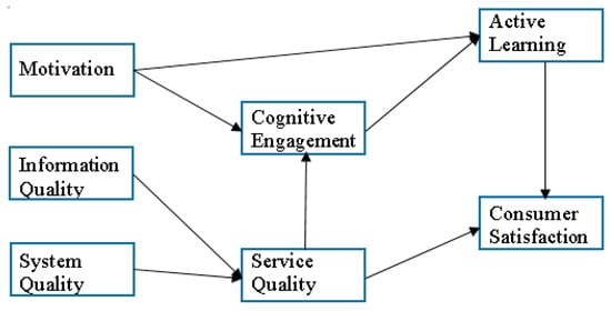 H1: There is a direct and positive relationship between system quality and service quality. This hypothesis is grounded in previous findings indicating that platform usability and accessibility directly impact perceived service effectiveness in digital contexts. As noted by [4], the quality of the technological infrastructure shapes user expectations and satisfaction with related services. H2: There is a direct and positive relationship between information quality and service quality. Research has shown that the clarity, accuracy, and relevance of content influence how users evaluate overall service delivery, especially in online learning environments [5,6]. Informational clarity is a precursor to trust and perceived reliability. H3: There is a direct and positive relationship between service quality and cognitive engagement. Service quality contributes to learners’ willingness to actively participate in educational activities. As suggested by [7], timely feedback, intuitive navigation, and access to support services are factors that increase users’ mental involvement and perceived control during learning. H4: There is a direct and positive relationship between motivation and cognitive engagement. According to [8,9], motivation is a key psychological driver of engagement. When users are intrinsically or extrinsically motivated, they tend to invest more cognitive effort into processing and applying learning content. H5: There is a direct and positive relationship between cognitive engagement and active learning. Cognitive engagement enables deeper information processing, which translates into behaviors such as problem-solving and critical thinking—core elements of active learning [10,11]. When learners are cognitively involved, they are more likely to participate interactively. H6: There is a direct and positive relationship between motivation and active learning. Motivation encourages users to take initiative in learning activities. As noted by [12], motivated learners tend to engage more frequently in self-directed tasks, discussions, and hands-on experiences that define active learning strategies. H7: There is a direct and positive relationship between service quality and consumer satisfaction. Previous studies have established a strong link between service quality and consumer satisfaction in digital environments. As reported by [4,5], users associate responsive support and reliable platforms with higher satisfaction levels. H8: There is a direct and positive relationship between active learning and consumer satisfaction. Active learning methods improve learning outcomes and emotional satisfaction with the educational process. Refs. [13,14] support the idea that hands-on, participatory learning environments lead to increased satisfaction, especially when they align with learners’ autonomy and goals. Each hypothesis in our conceptual model is grounded in established theories and validated measurement frameworks. For example, the relationship between system quality and service quality (H1) is supported by prior applications of the Web-Based Learning Environment Instrument (WBLEI) [