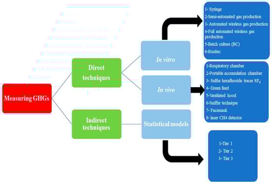 Given the significance of CH4 emission, it is crucial to address methods for measuring these emissions before delving into diverse strategies aimed at mitigating GHG releases from ruminants, with CH4 being the primary component. It is essential to acknowledge that while direct control over emissions is limited, managing the factors that influence them, such as diet, animal genetics, and manure handling, is key to effective mitigation. Several techniques have been developed to assess CH4 emissions in the fermentation process. These methods include direct measurements of the generated gas, conducted either in vitro or in vivo. To determine the most suitable scientific method, factors like accuracy, dimensions, cost, and the experimental model must be considered. Awareness of the feasibility and limitations of each technique is essential. The pursuit of rapid, precise, and straightforward methods for measuring CH4 and other products of ruminal fermentation has been a focal point in studies on ruminal nutrition. Various techniques have been developed, by different countries, to quantify CH4 emissions from ruminants across diverse experimental conditions (Figure 2 and Table 1). These techniques, rooted in animal nutrition, aim to assess energy losses in ruminants that are fed different diets and prove valuable in assessing the environmental efficiency of the production system. Each method comes with its own set of advantages and disadvantages concerning the comprehensive depiction of ruminal fermentation.