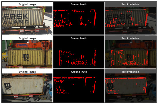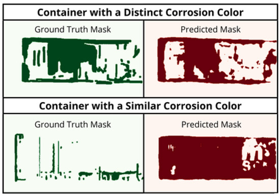 Comparison of ground truth masks and model predictions for containers with distinct and similar corrosion colors.