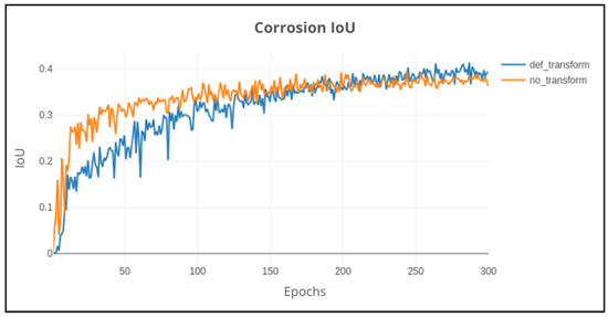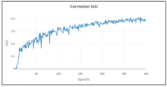 DeepLabv3+: Validation performance of corrosion IoU on 300 epochs using default parameters.