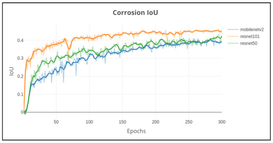 DeepLabv3+ (bold lines: smoothed): Impact on validation performance using MobileNetv2, Resnet50, and Resnet101 backbone network models on 300 epochs.
