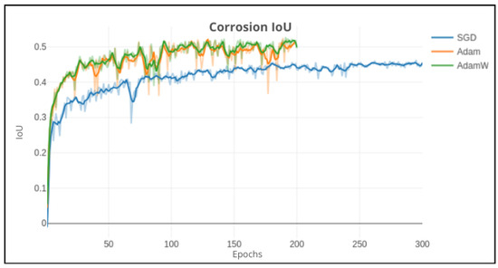 DeepLabv3+ (bold lines: smoothed): Impact on validation performance using SGD on 300 epochs, Adam and AdamW on 200 epochs.