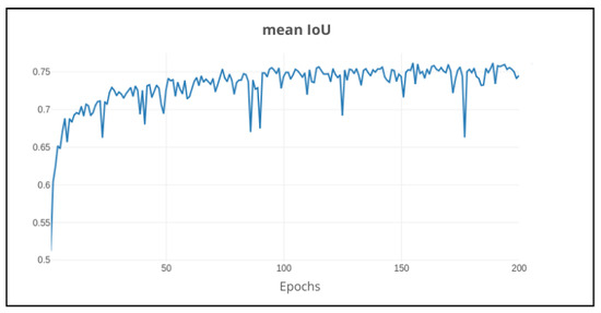 Validation mean IoU using ResNet101 and AdamW (lr = 0.002) on 200 epochs.