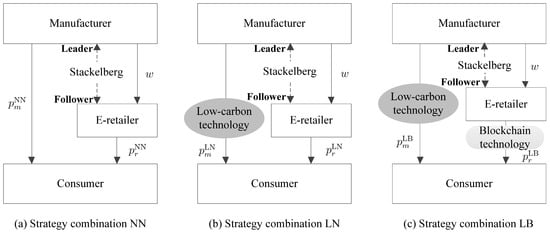Furthermore, consider the following three strategy combinations between the manufacturer and the e-retailer: (1) neither the manufacturer nor the e-retailer adopts any technology, denoted as NN; (2) the manufacturer adopts low-carbon technology, while the e-retailer does not use blockchain technology, denoted as LN; (3) the manufacturer adopts low-carbon technology, and the e-retailer introduces blockchain technology, denoted as LB. Specifically, the supply chain structures and the above strategy combinations are shown in Figure 1.