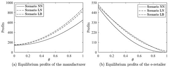 From Proposition 5, both the direct sales price and the retail price under the strategy combination LB are higher than those under the strategy combination NN. The manufacturer adopts low-carbon technology not only to meet regulatory or environmental targets but also as a proactive differentiation strategy to appeal to consumers with strong sustainability preferences, enhance brand reputation, and capture premium market segments. The e-retailer, in turn, implements blockchain technology to strengthen consumer trust in the authenticity of green claims by enhancing transparency and traceability. Blockchain adoption reduces information asymmetry and increases consumers’ perceived value of low-carbon products, leading to stronger purchase intent and greater price acceptance. Together, these strategic moves create a synergistic effect, i.e., allowing both parties to charge higher prices and extract greater value from environmentally conscious consumers. Thus, the pricing decisions under strategy LB stem from both cost recovery and deliberate efforts to reinforce competitive positioning through sustainable and trustworthy supply chain practices.