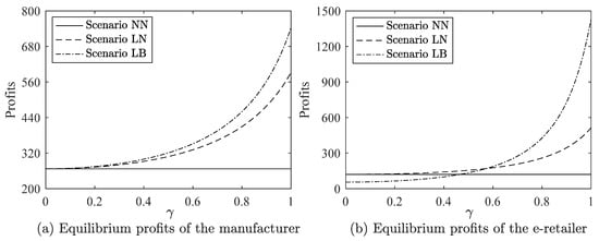 Corollary 5 shows that under the strategy combination LB, the prices and green level all increase, as increases. A high induces the manufacturer to improve the product environmental friendliness to draw in a larger consumer base. The high cost of increasing greenness of products leads to a high direct sales price. In addition, the e-retailer enhances prices to recover additional costs of blockchain adoption.