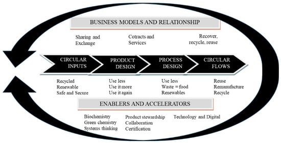 Additionally, as pointed out by Weetman [], the business model and its relationships must be interpreted, applying circular inputs to it (recycling, renewing, protecting), reformulating the design of product (utilize less, employ it more, and reuse it), the design of the process (to use less, use waste as food, renew) and implementing circular flows (reuse, remanufacture, and recycle), and looking for enablers and accelerators along the value chain to find possible benefits applicable to the practical case, as represented in Figure 1.