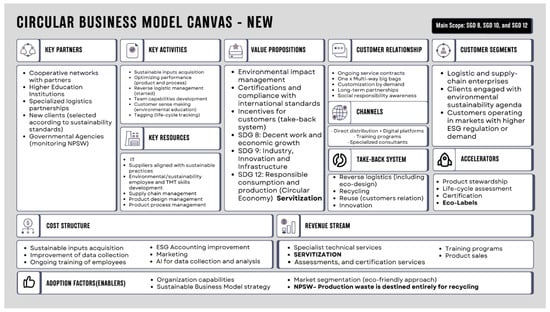 Moreover, the literature on CE has suggested that the circular business model canvas (CBMC) has advantages over original canvas or sustainable business model archetypes, such as demonstrating circularity for each business model component, including take-back and adoption procedures, highlighting the main barriers to converting from a linear to a circular business model [,] being simpler and easier for users to utilize than the triple-layered business model canvas (TLBMC) to construct sustainable business models [,].