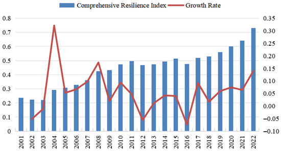 In Figure 2, the overall dimensions of China’s OGI resilience showed a fluctuating upward trend from 2001 to 2022.