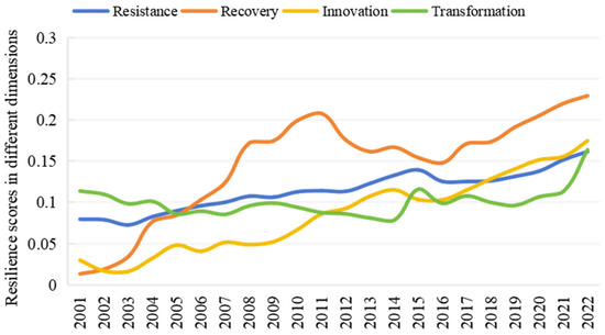 Trends in Resilience Index of China’s OGI Chain in Different Dimensions from 2001 to 2022.