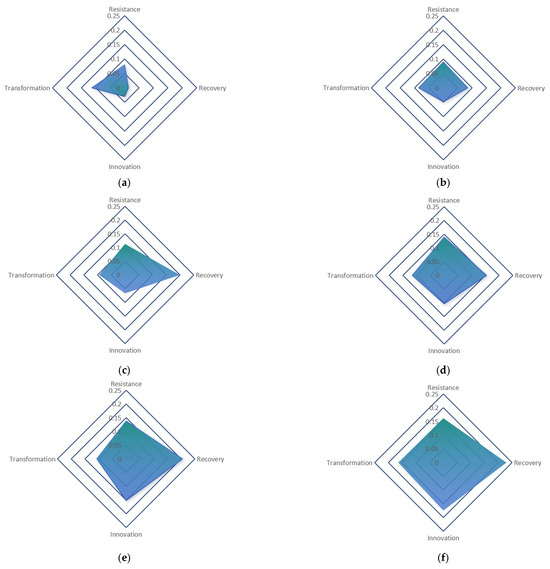 Radar Chart of the Resilience Index Evolution of China’s OGI Chain. (a) Resilience Scores for Various Dimensions in 2001; (b) Resilience Scores for Various Dimensions in 2005; (c) Resilience Scores for Various Dimensions in 2010; (d) Resilience Scores for Various Dimensions in 2015; (e) Resilience Scores for Various Dimensions in 2020; (f) Resilience Scores for Various Dimensions in 2022.