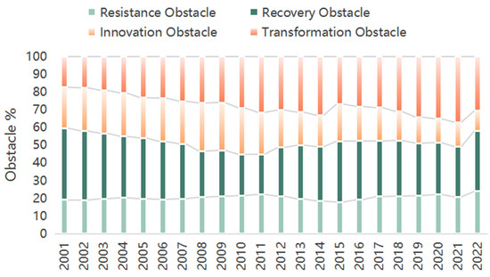 As shown in Figure 4, the obstacle values across the four dimensions fluctuated between 2001 and 2022. The obstacle degree in the resistance dimension remained relatively stable, with slight increases observed from 2006 to 2011 and again from 2015 to 2022. The recovery dimension exhibited the greatest fluctuation, with a continuous decline between 2001 and 2011, followed by a significant increase from 2012 to 2015. The obstacle degree in the innovation dimension showed an overall downward trend, whereas the transformation dimension experienced a fluctuating upward trend. These patterns delineate two stages: the first from 2001 to 2014, and the second from 2015 to 2021.