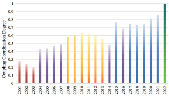In Figure 5, the overall coordination of the various subsystems of China’s OGI chain resilience shows a volatile upward trend from 2001 to 2022. For phase-specific feature analysis, a hierarchical study of coupling coordination relationships was conducted.