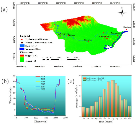 (a) Digital Elevation Model (DEM) of the Han River Estuary segment; (b) morphological changes at the Hankou cross-section; (c) hydrological processes at Hankou Station with and without TGD operations.