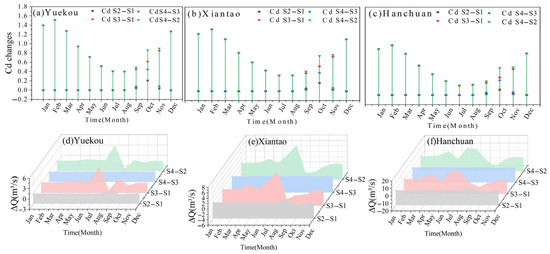 Variations in discharge and backwater coefficient at the Han River Estuary under different computational scenarios. (a–c) denote the Cd differences between the scenarios, while the (d–f) present the flow differences between the scenarios.