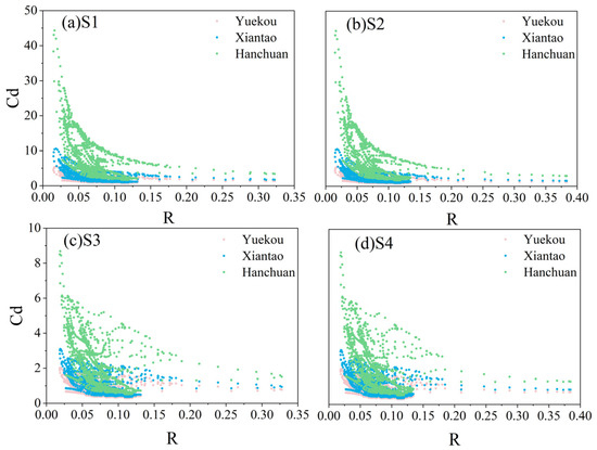 The coupled scenario (S4) reveals nonlinear interactions: In low-R zones, the antagonistic effect between downcutting and dry-season flow supplementation drastically reduces Cd at Hanchuan Station (only 2.5 at R = 0.05—94% lower than S2 and 69% lower than S3). In high-R zones, synergistic effects further suppress Cd (Hanchuan Station: Cd ≈ 1.0 at R = 0.3). Notably, a slope mutation occurs at Xiantao Station (R = 0.15 in S4), highlighting the mid-reach’s sensitivity to coupled mechanisms. Spatial variation analysis confirms that Hanchuan Station experiences the strongest perturbation (maximum amplitude: 95% from S1–S4), evidencing the estuary proximal zone’s high sensitivity to the “downcutting-regulation” coupling.
