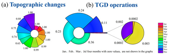 The monthly average contribution rate of topographic influence is generally higher than that of operational influence. Its annual contribution rate ranges from 0.63 to 1.00. Within this, the mean rate during the flood season (June–September) is 0.84, and during the dry season (January–March) it reaches 1.00. Overall, it shows an annual trend of first decreasing and then increasing: high during the dry season, decreasing during the water storage period of the TGD, and lowest during the flood season. This indicates that the reduction in flow resistance caused by channel downcutting in the confluence area has a dominant effect on amplifying the outflow throughout the year. Particularly from January to July, the contribution rate mostly remains above 0.99, reflecting that significant bed erosion at the Han River estuary during extreme flood periods substantially reduces the backwater potential of the main stem (Yangtze River), causing topographic factors to completely dominate the outflow.