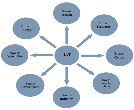 IoT has several different applications that cover practically all parts of daily life. It addresses several fields, for example, transport, farming, smart cities, supply chain, industry, healthcare, energy, environment, and so on, as shown in Figure 1. For healthcare, IoT can be utilized for patient tracking, medical cold storage, fall recognition, and dental applications. For an intelligent environment, it can be used for temperature tracking, disaster avoidance, water quality checking, wildlife protection, forest fire recognition, and air quality tracking. The function of IoT in industrial sectors generally includes monitoring for explosive and hazardous gases, checking gas, oil, and water quantities, performing repairs and maintenance, controlling vehicle fleets, monitoring indoor air quality, recognizing ozone, tracking temperatures, and initiating recovery actions. In farming, it can be utilized for air quality checking, animal, greenhouse, and field tracking, water and soil management, and pest management. In the automotive field, it can be used in numerous areas, for example, automobile servicing, automobile monitoring, automated toll and fine payments, accident recognition, fire recognition, entertainment with connected vehicles, velocity tracking, and motorist recognition [5].