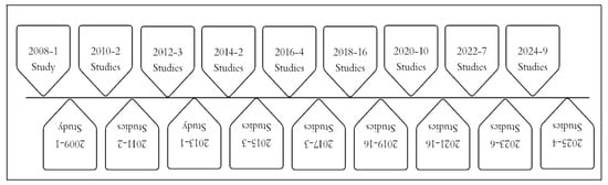 Figure 2 illustrates a more comprehensive, structured, and hierarchical view of the IoT-based vehicle accident detection and notification system. The timeline (Figure 3) illustrates the evolution of the chosen research studies from 2008 to 2025, highlighting key review periods.