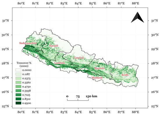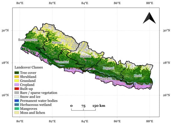Nepal is situated between the longitudes 80.08 E and 88.17 E and latitudes 26.39 N and 30.42 N (Figure 1). The country is mountainous (3265 m above sea level) and bordered by Tibet and India. It has an area of 147,180 sq. km [40], of which nearly 41.6% of the land area is estimated to be forest area. The total population of Nepal is estimated to be 29,694,614 [40]. Figure 1 displays the land use land cover map of Nepal obtained from the Sentinel-2 2020 ESA World Cover Map, along with provincial boundaries. There are a total of 7 provinces and 77 districts in Nepal [41].