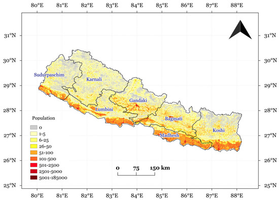 Population map of Nepal derived from the LandScan Global Population Dataset for the year 2000.