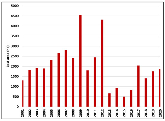 Forest loss by year with threshold of tree cover greater than 50% for Nepal derived from GFC dataset. A clear decline in the lost area can be seen, suggesting effective forest protective measures in the country.