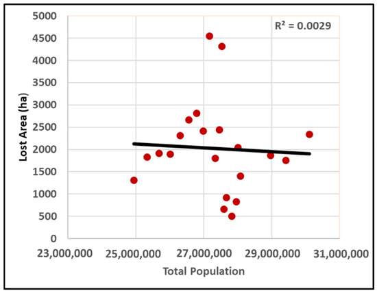 Forest loss by year, using a threshold of tree cover greater than 50%, derived from University of Maryland GLAD data (2001–2020), is shown in Figure 4. The plot indicates a clear decline in forest loss over time. Additionally, the relationship between Nepal’s total population and forest loss during the corresponding years showed a slight negative slope with a very weak correlation (R2 = 0.000290), suggesting that population growth had little to no direct impact on forest loss at the national level during this period (Figure 5). However, detailed spatial analysis revealed distinct localized patterns that suggest more complex patterns. While national trends indicate overall stability or improvement, several regions, particularly in the mid-hills and along urban fringes, exhibited concentrated forest degradation. These losses were often associated with infrastructure expansion, agricultural encroachment, and settlement growth and, in some cases, showed relatively strong correlations with population increases. These localized dynamics highlight the importance of sub-national analysis, as aggregated national statistics can obscure critical land cover change processes occurring at finer spatial scales.
