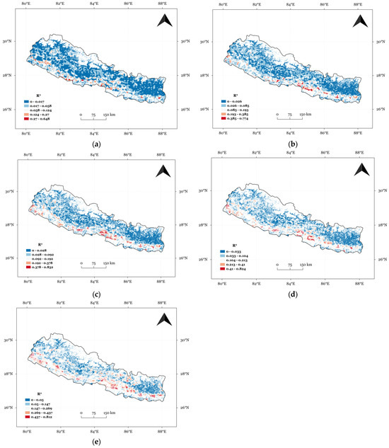 Figure 6a–e illustrate the spatial results of the GWR model at the pixel level for different years. These maps reveal spatial variability in R2 values across the country. In 2000 and 2005, the highest local R2 values reached 0.64 and 0.77, respectively; in 2010, they peaked at 0.83; and in 2015 and 2020, they stayed at 0.82 and 0.81, respectively.