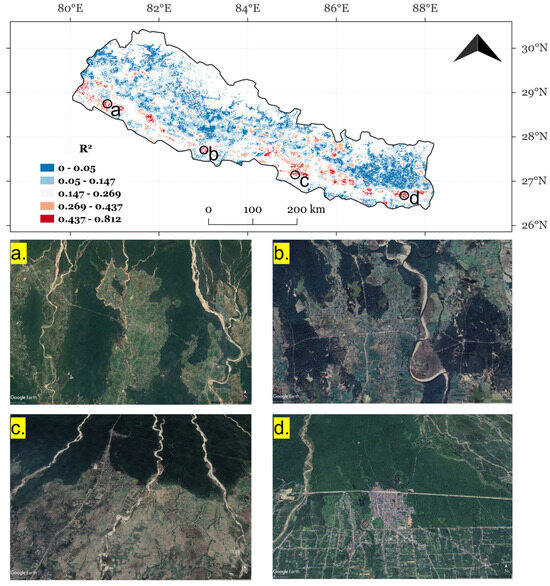 To better understand the regions where population is most strongly correlated with tree cover loss, a detailed analysis was conducted for 2020. To validate the GWR findings, supplementary visual analysis was performed using high-resolution imagery from Google Earth to identify high-R2 areas, which were examined more closely through spatial zoom-ins (Figure 7a–d).