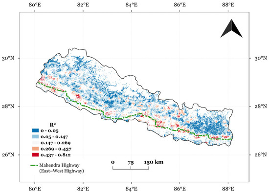 Further, a closer examination of spatial patterns reveals that the identified GWR hotspots are predominantly concentrated along Nepal’s major transportation corridor—the Mahendra Highway (East–West Highway). This highway stretches from Bhim Dutta in the far west to Mechinagar in the far east, connecting key urban centers and driving development across the Terai region. Many of the high-R2 areas in the 2020 GWR analysis are situated near this corridor, suggesting that proximity to major roads is a critical factor in accelerating deforestation. These regions are likely experiencing rapid urbanization, agricultural expansion, and infrastructure development, all facilitated by increased accessibility. The spatial extent of these hotspots and their alignment with the East–West Highway are illustrated in Figure 8. A shapefile containing the coordinates and boundaries of these identified hotspots is available upon request for further research, planning, or policy development.