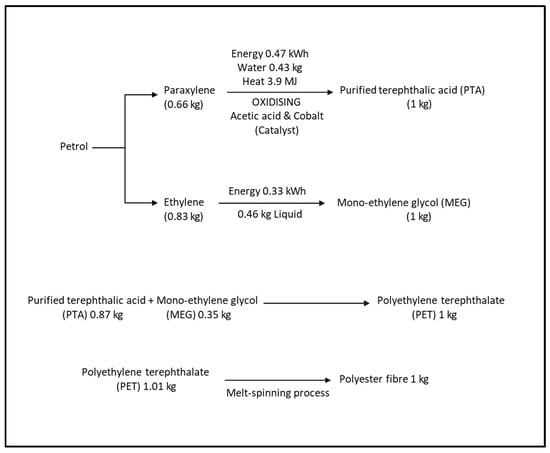 Polyester is primarily made from polyethylene terephthalate (PET). Its production begins with the extraction of crude oil through mining operations and its cracking [43]. Crude oil with a boiling point of 104–157 °C, called naphtha, is broken into smaller reactive molecules of ethylene, propylene, various butylene compounds, and butadiene [26]. Among these, ethylene is the key raw material for PET and, in turn, polyester fibre production. The cracking of naphtha is followed by chemical processes to produce purified terephthalic acid (PTA) and monoethylene glycol (MEG), which are then reacted to form the PET resin. PET resin is then converted into polyester yarns via a melt spinning process [44]. Figure 1 illustrates the transformation of petrochemical feedstocks (ethylene and terephthalic acid) into PET, the precursor to polyester fibre, highlighting the importance of upstream process inclusion in LCA modelling [43,45].