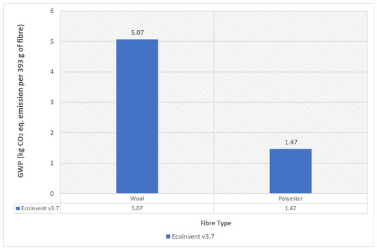 By incorporating updated data from AgResearch and ecoinvent v3.10, the comparative GWP of wool and polyester fibres shifted substantially. The adjusted wool impact was derived from region-specific modelling conducted by AgResearch [54] in parallel to the petrochemical emissions added to ecoinvent v3.10 for polyester fibre [46]. These revisions resulted in a reduction in the wool GWP by approximately 29%, from 5.07 kg CO2 eq. to 3.6 kg CO2 eq., and an increase in the polyester GWP by 26%, from 1.47 kg CO2 eq. to 1.85 kg CO2 eq.
